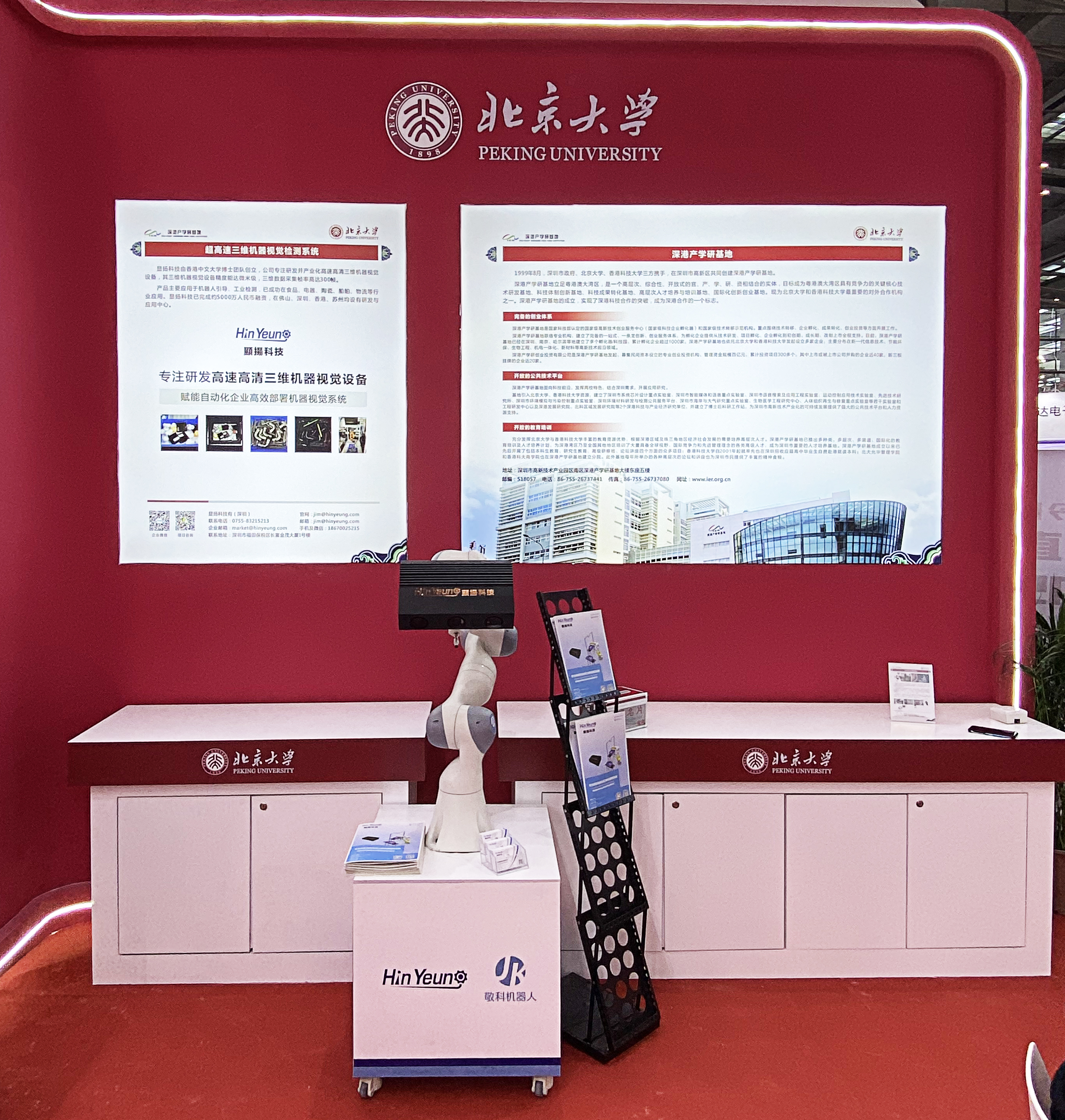 此屆高交會,顯揚科技聯合敬科機器人,以及北京大學聯合展出展品-《超高速三維機器視覺檢測系統》。此系統由顯揚科技與敬科機器人聯合開發,其中顯揚科技負責研發高速高清三維機器視覺設備、三維數據分析系統,敬科機器人負責研發協作機械臂,以及機械臂智能控制算法。